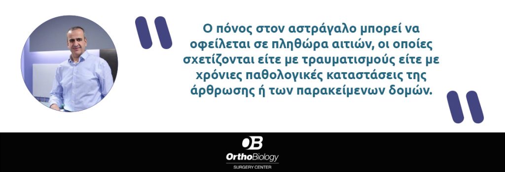 Ο πόνος στον αστράγαλο μπορεί να οφείλεται σε πληθώρα αιτιών, οι οποίες σχετίζονται είτε με τραυματισμούς είτε με χρόνιες παθολογικές καταστάσεις της άρθρωσης ή των παρακείμενων δομών.